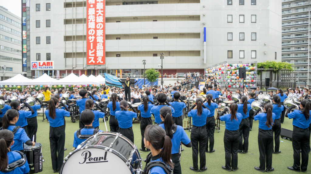 朝からとても暑い中、早朝より準備・練習、そしてリハーサルを行い、登場したのは県立湘南台高等学校 吹奏楽部 White Shooting Starsのみなさま。